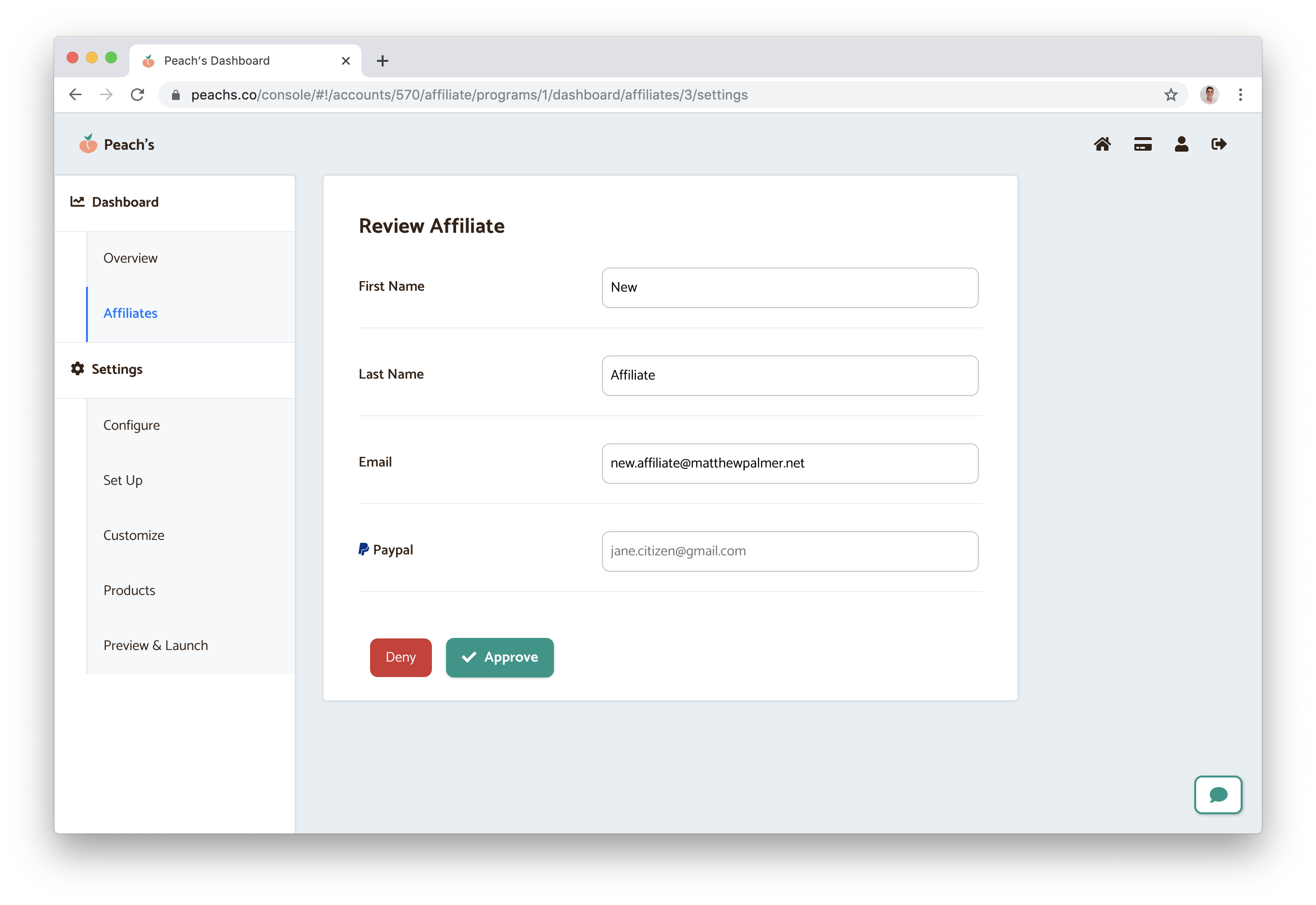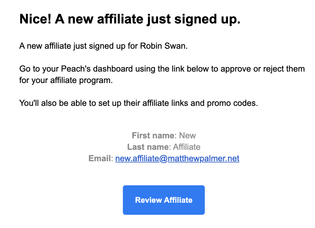 After an affiliate signs up, they're “Pending.” You can go into your affiliate program and review the affiliates for their suitability for your referral program. Once approved, customize any information for your affiliates – for example, if you want them to use a certain promo code, you could set that up now.