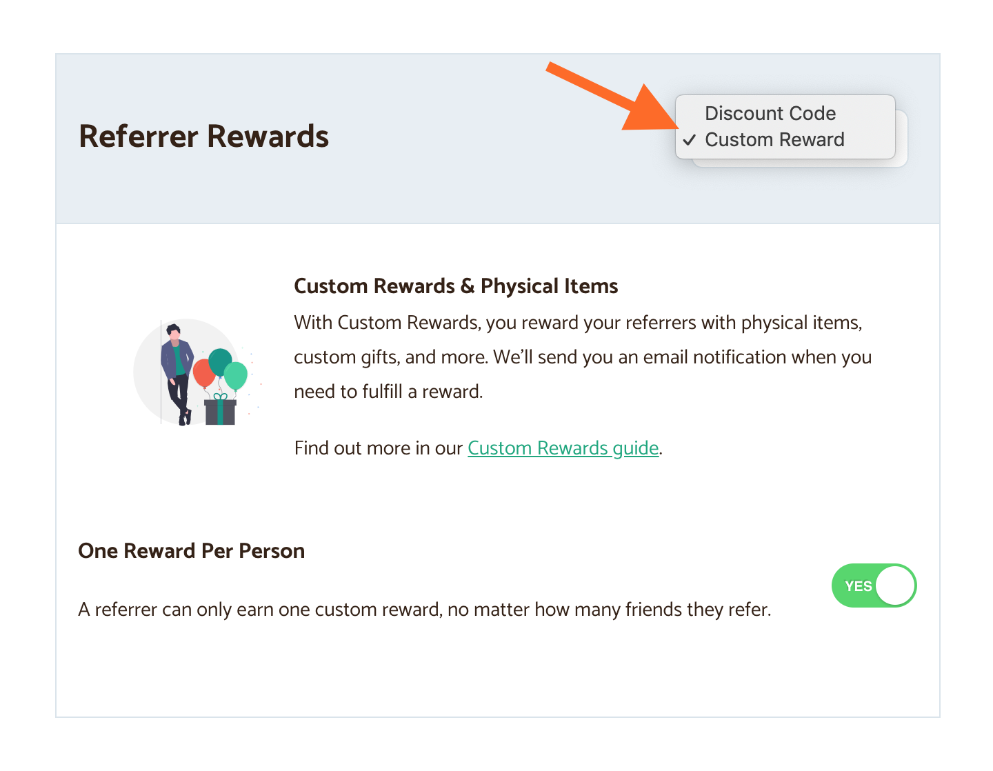 Under Referrer Rewards in your Peach’s dashboard, switch from Discount Codes to Custom Rewards in the dropdown.