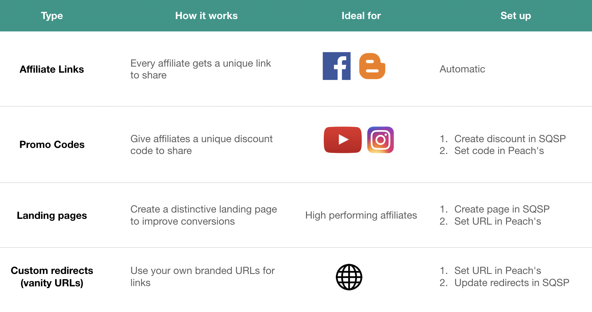 Peach's supports a wide range of affiliate sharing options to support what works best for your business and brand. Each of these options will attribute the same orders and commissions to the affiliate. What varies is how the affiliate shares your store with their audience.